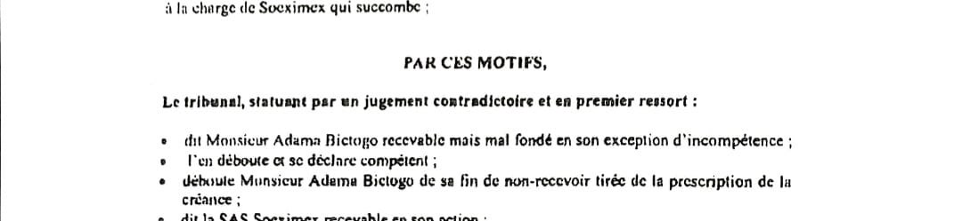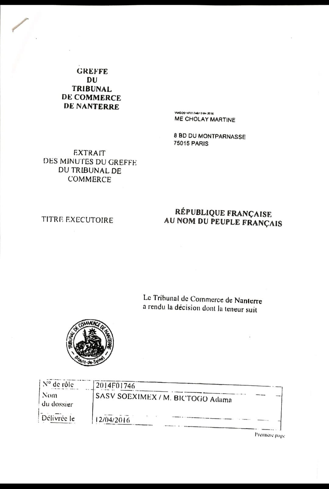 Le tribunal de commerce de Nanterre a toutefois, le 12 avril 2016, partiellement débouté Adama Bictogo et retenu que la dette demeurait exigible. Le tribunal de Nanterre a aussi autorisé que son appartement de Courbevoie, en banlieue huppée de Paris, soit hypothéqué au profit de ses créanciers français. Ce qui est le cas à ce jour.