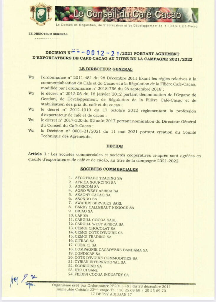 Voici la liste des sociétés ayant obtenu un agrément pour l’exportation du binôme café-cacao sur la campagne 2021-2022. Il s’agit notamment de 57 sociétés commerciales et de 37 sociétés Coopératives pour la campagne 2021/2022. DECISION N°0012-21 DU 09 septembre 2021 PORTANT AGREMENT DES EXPORTATEUR… La filière cacao pèse lourd dans l’économie ivoirienne : elle représente […]