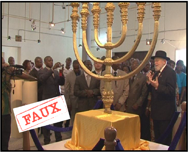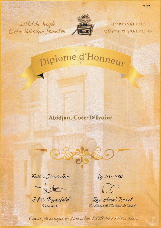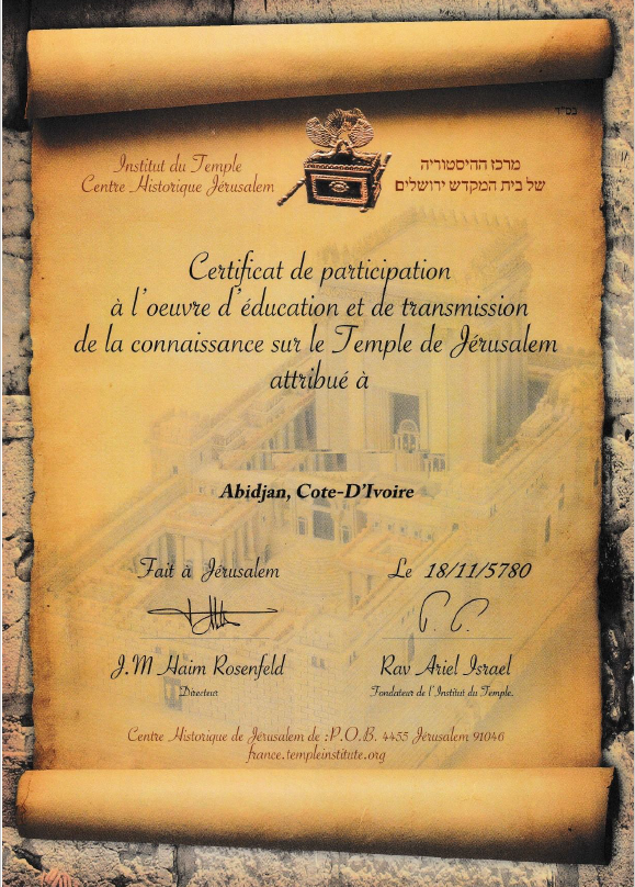 Copie d’un faux certificat de « participation à la construction du Troisième Temple » distribué par Monsieur Jean-Marc Rosenfeld à diverses communautés africaines.