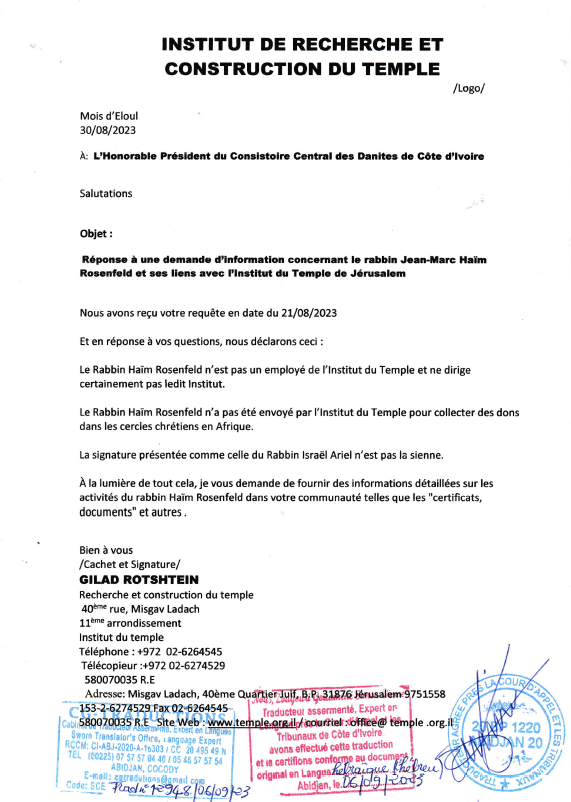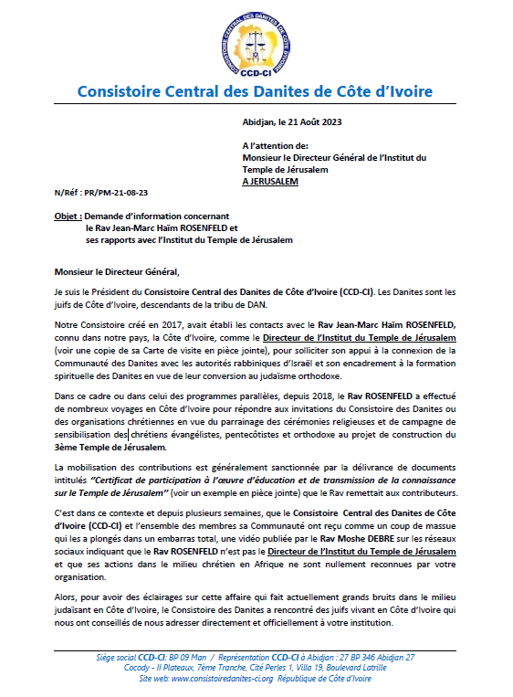 Courrier officiel adressé par la Communauté Danite de Côte d’Ivoire à l’Institut du Temple de Jérusalem, sollicitant une clarification sur l’identité et les activités de Monsieur Rosenfeld.