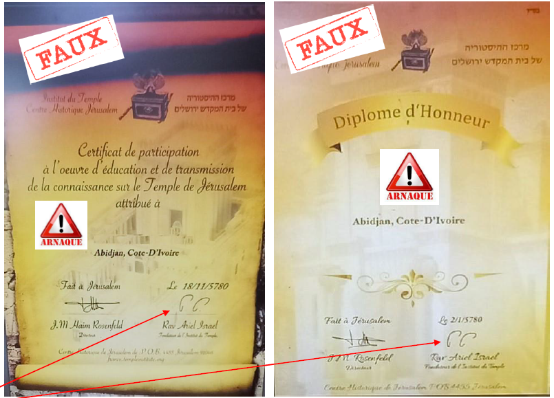 Plus inquiétant encore, un centre rabbinique de Jérusalem, le Centre Shaarey Kedusha Outefilah, dirigé par le Rav David Daniel Hacohen, est soupçonné de complicité dans cette escroquerie. Celui-ci aurait émis de faux certificats attribuant à Rosenfeld des titres de « Grand Rabbin de Côte d’Ivoire », usurpant ainsi l’autorité religieuse officielle.