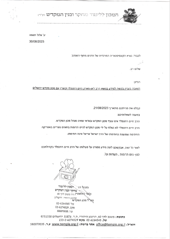 Dans un courrier officiel, Gilad Rotshtein, directeur de cet Institut, dénonce la falsification de la signature du rabbin Ariel Israel, fondateur de l’Institut, utilisée par Rosenfeld pour fabriquer de faux certificats de participation à la construction du Troisième Temple. Ces documents ont été remis à diverses communautés en Afrique, dans le cadre d’une collecte de dons illégale et interdite par la Torah.