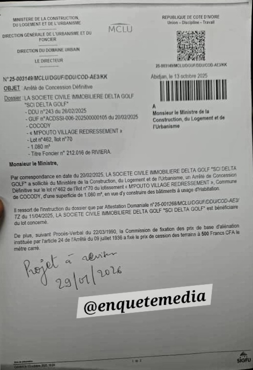 L’instruction du dossier constitue le second levier d’influence de la DDU. C’est sous l’autorité d’Abdoulaye Diallo que sont vérifiés les plans de bornage et la conformité du lotissement « M’Pouto Village Redressement ». L’absence de déclassement préalable de cette zone lagunaire — procédure pourtant impérative pour qu’un bien passe du domaine public au domaine privé de l’État — n’a pas empêché le dossier de progresser.
