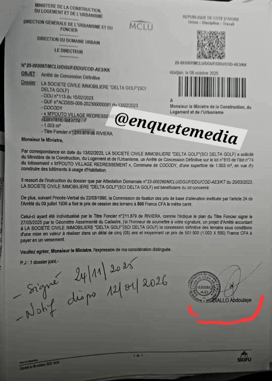 L’enquête révèle que l’intervention de la DDU en mars 2023 a été le catalyseur de l’attribution finale de l’ACD. Sans cette attestation domaniale, la SCI Chad n’aurait pu franchir les barrières de contrôle du ministère. L’attribution de cet ACD repose sur une chaîne de responsabilités où le Géomètre assermenté fournit la matière première technique en convertissant indûment des coordonnées maritimes en parcelles terrestres, permettant ainsi à Abdoulaye Diallo, Directeur du Domaine Urbain, d’activer son rôle charnière de validateur. Ce dernier, en certifiant la disponibilité du lot malgré l’aberration géographique, agit comme le véritable verrou du système en « poussant » le dossier vers l’étape ultime : la signature du ministre Bruno Koné. Ce dernier, bien que porteur de la validation politique et juridique finale, se retrouve de fait tributaire de la confiance technique accordée à son DDU, faisant de  Abdoulaye Diallo le responsable de la conformité de l’acte au regard de la loi foncière.